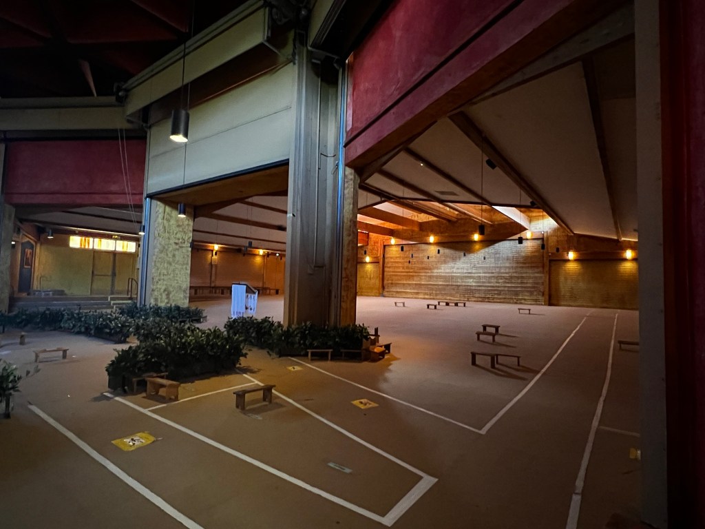 The space is simple, like an open gym with partitions which are opened or closed depending on the number of people.