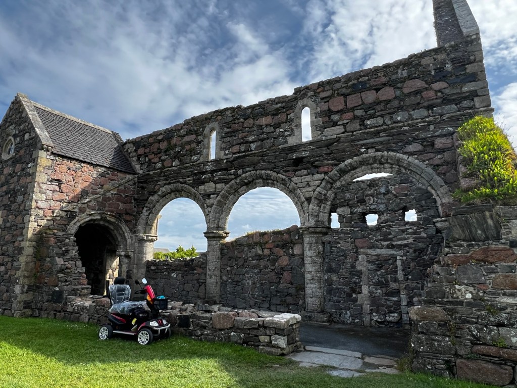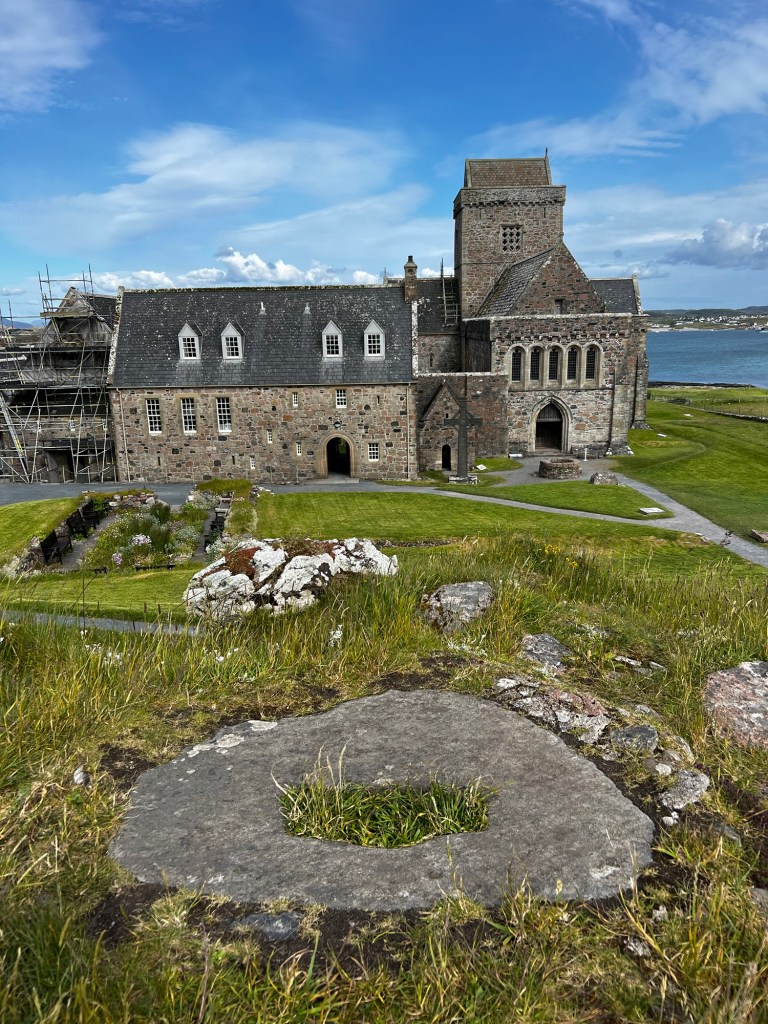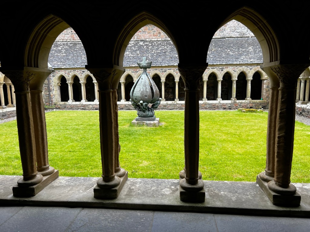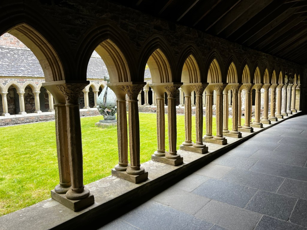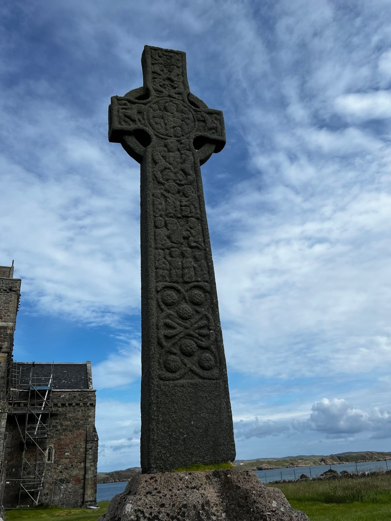 In the centuries after, despite raids by Vikings, the Abbey flourished. The Book of Kells, a work of art as well as a Bible, was created along with hundreds of other bibles in the scriptorium. Remember this is before printing presses so the only way to make more bibles is to handwrite them. Pilgrims flocked to Columba’s shrine. And the wealthy wanted to be buried in this holy place. The burial site is said to hold 48 Scottish kings and a variety of abbots, monks, warriors, and great lords.