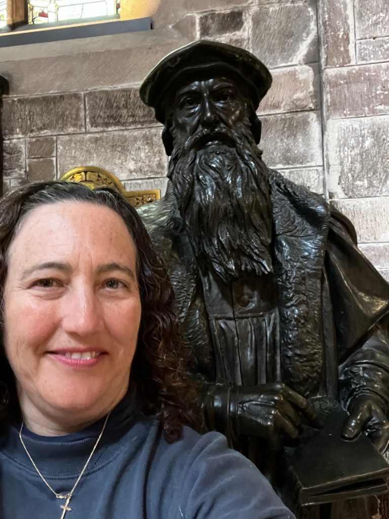 Here is a brief overview of Knox and his importance. He was born in 1513 and trained as a Roman Catholic priest but joined a growing reformation movement in the 1540’s. After being caught up in political events at St. Andrews, he was taken prisoner and enslaved on a French galley ship. Not many make it our of that experience alive, but Knox managed to be released and went into exile landing in Geneva. He ran into another reformer, John Calvin, who greatly influenced Knox’s understanding of the church.In 1558 Protestantism was beginning to take hold in Scotland and upon Knox’s return in 1559, he marched an army of followers into St. Giles and preached there for the first time. The following week he was elected its minster and the building was stripped of its stained glass and images. In 1560 the Scottish Parliament abolished papal authority and St. Giles no longer was a Catholic Church. Knox died in 1572 after being instrumental in establishing a Presbyterian system of church government, a democratic tradition, and a commitment to education which lead to the Scottish Enlightenment and many Scottish Presbyterian involved in drafting the US Declaration of Independence and the US Constitution. And that’s John Knox in a nutshell.