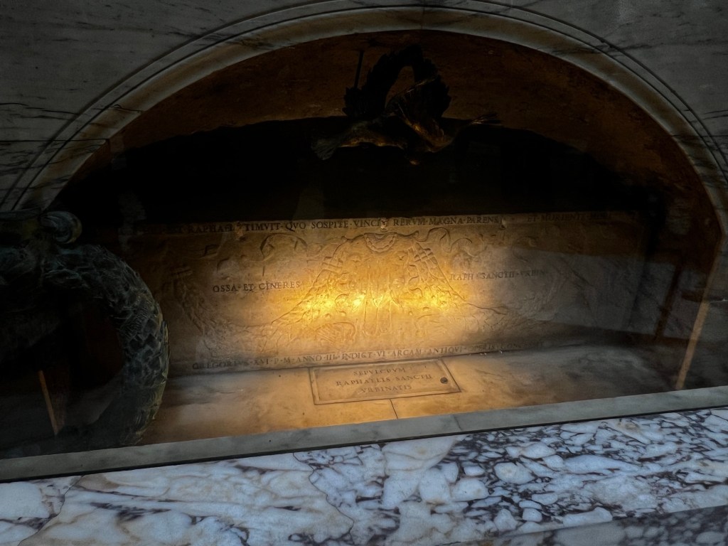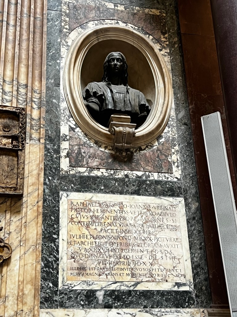 Many people are buried in the Pantheon, the most well-known being Raphael. This extraordinary artist died at the age of 37 and his tomb and bust are part of this place of worship.