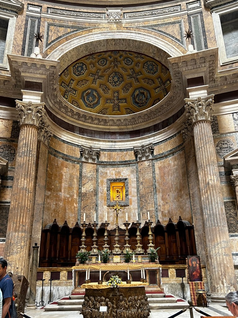 Pan means “all.” Theo means “god.” So the Pantheon was a church dedicated to all the gods, just to cover all the basis. The dome is actually concrete and yes, there is a hole at the top called the Oculus. So how do they keep this temple from flooding? Why an interior drainage system, of course. The entire floor is slanted ever so slightly with the highest point in the middle of the room. Tiny drain holes are actually in the tiles. They thought of everything!