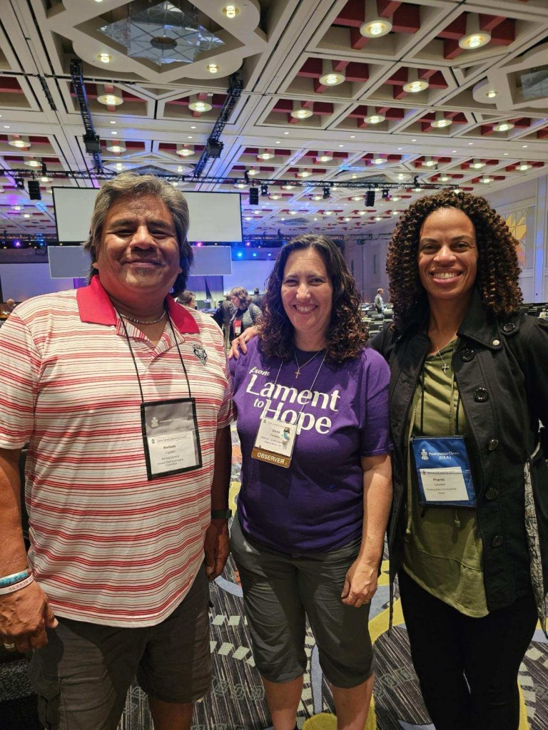 But I wasn’t there just to watch decisions get made. I was there to reconnect with people. Throughout the past 25 years of ordained ministry, 3 presbyteries, and 2 degrees from different seminaries, I have gotten to know many people. General Assembly is a Homecoming to reconnect with those from the past and get to know more Presbyterians throughout the country. Among those I ran into were Terry with whom I went to seminary and shared an internship with in West Virginia. Pictured in the middle. We had way too much fun sitting in the back as the peanut gallery.
