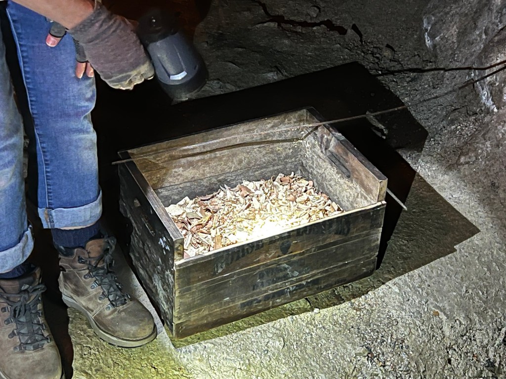 The men worked 10 hour days in the mud and rats exploding unstable dynamite in closed quarters. They were completely stripped search when they left work each day to make sure they didn’t steal any silver. And for the “facilities,” well a straw box was all you got. Here is one of them.