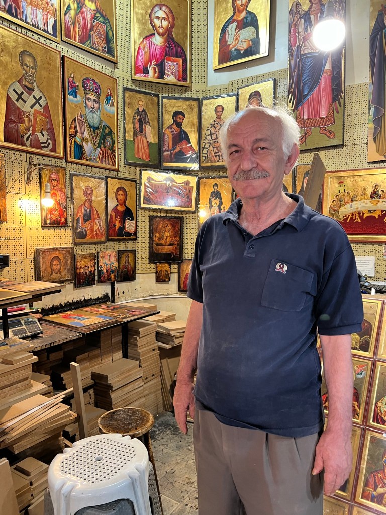 I did get a chance to duck into an icon store which was the workshop of an iconographer. I just couldn’t resist getting one and taking a picture of the artist himself.